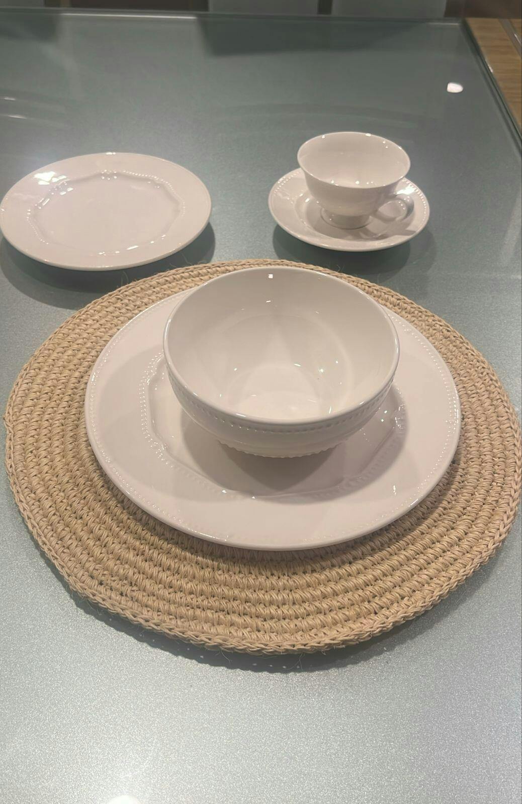Convierte tus comidas diarias en momentos especiales: este set de vajilla de porcelana ofrece resistencia al uso diario y mantiene su color blanco impecable; incluye todo lo necesario para 4 puestos completos.