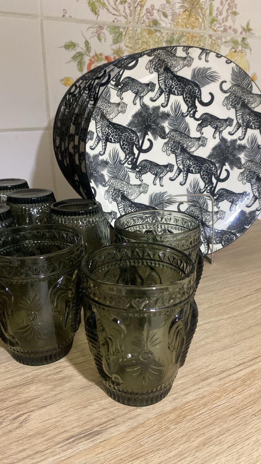 Este set de 4 vasos de vidrio gris combina estética vintage con funcionalidad, resaltando figuras en alto relieve que evocan lo artesanal. Son resistentes y con capacidad de 300 ml, ideales para cocteles y bebidas frías. Su diseño con textura decorativa aporta un toque único a tu mesa.